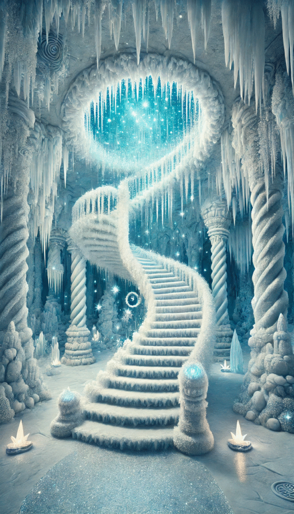 La carte magique de l’oracle bleu givré de l’escalier enneigé en spirale symbolise ton ascension. En effet, vers une nouvelle compréhension de toi-même et du monde qui t’entoure. En effet, chaque marche franchie te rapproche d’une lumière céleste, source de vérité et de sagesse. Bien que le chemin puisse sembler froid et exigeant, ton courage et ta persévérance te permettront de t’élever. En effet, il te sera révélé des vérités cachées et te permettra une transformation intérieure éblouissante.