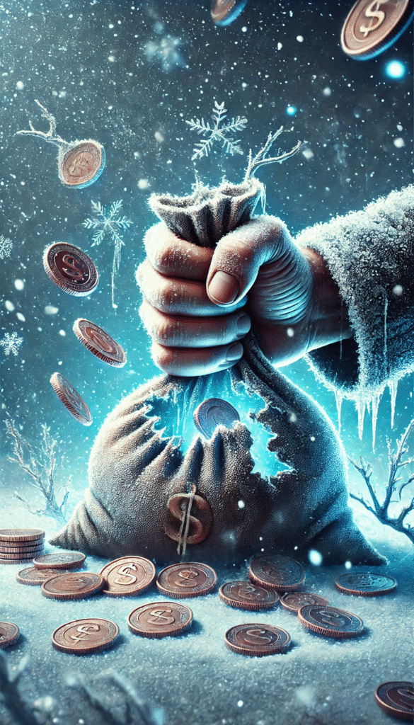 Cette illustration montre une poigne ferme. Par ailleurs, elle tient un sac percé d’où s’échappent des pièces dans un paysage glacé.